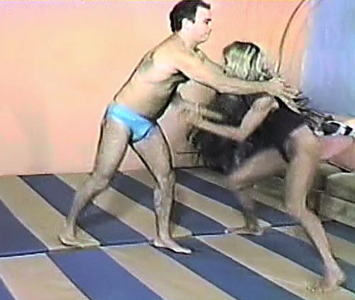 It is apparent Lee, too, is having fun as she proceeds to work the struggling male over, but his attempts to defend himself, anger Lee, and she yanks his head into her crotch, puts her knee into his neck, applies a tight school-boy pin and grabs him roughly and yanks at his vulnerable area.
